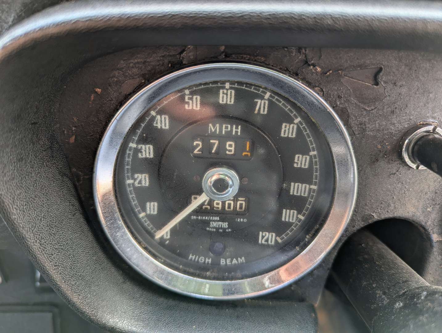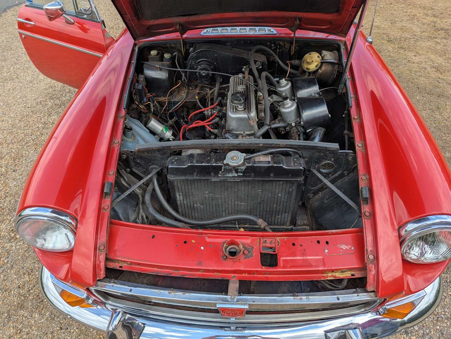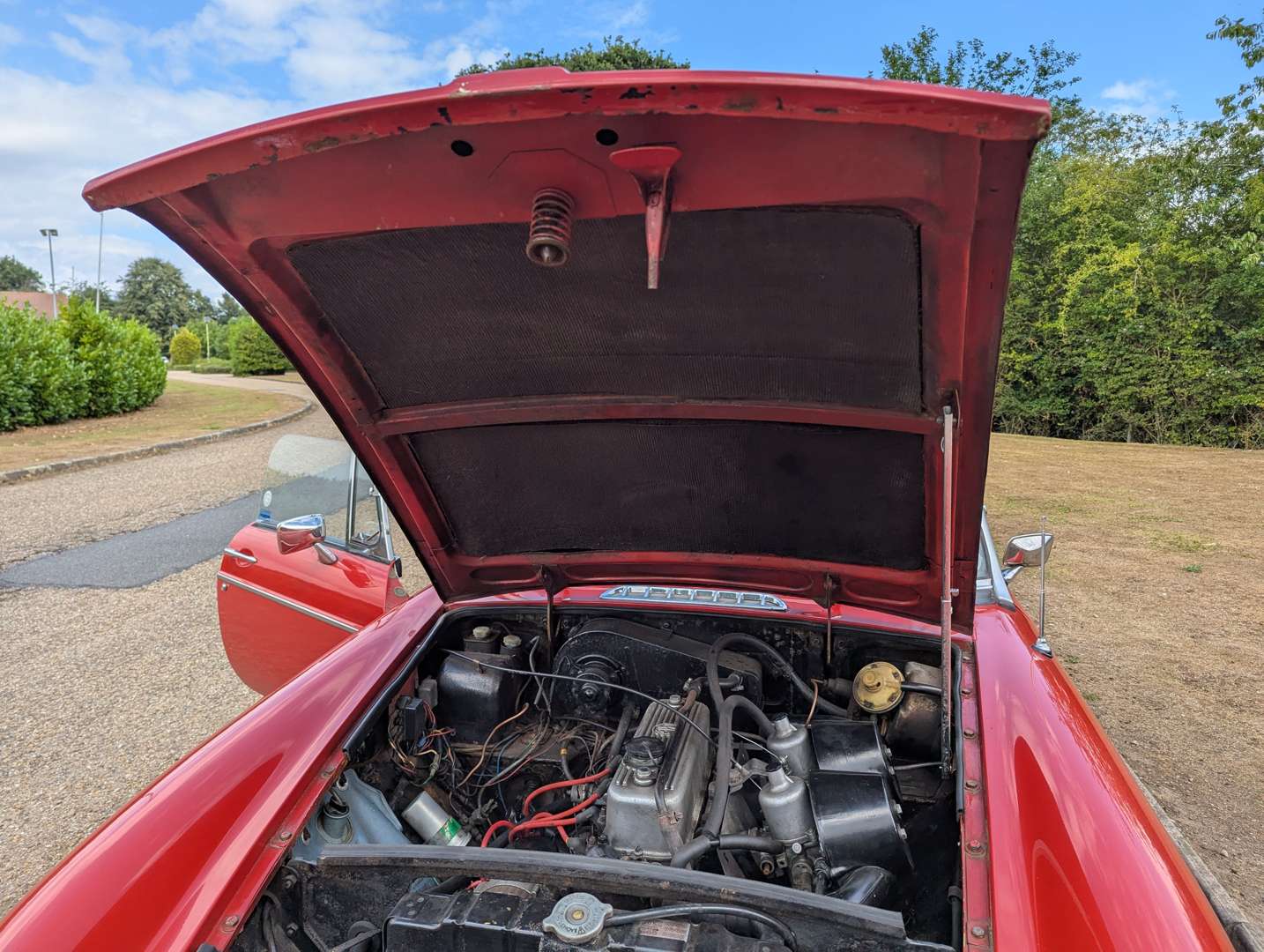 This chrome bumper MGB was first registered on 16th September 1974 and comes with an MOT to May next year. The Tartan Red paint is in presentable overall condition, and the car wears a couple of stickers from the 2018 Le Mans Classic. Its history includes a good selection of receipts going back to 1990, with evidence of a gearbox replacement in 1993. You will also find a BMIHT Heritage Certificate confirming that this car left the factory on 22nd April 1974 as a Home Market model with overdrive and Harvest Gold paint. A battery cut-off switch is installed behind the driver's seat.
