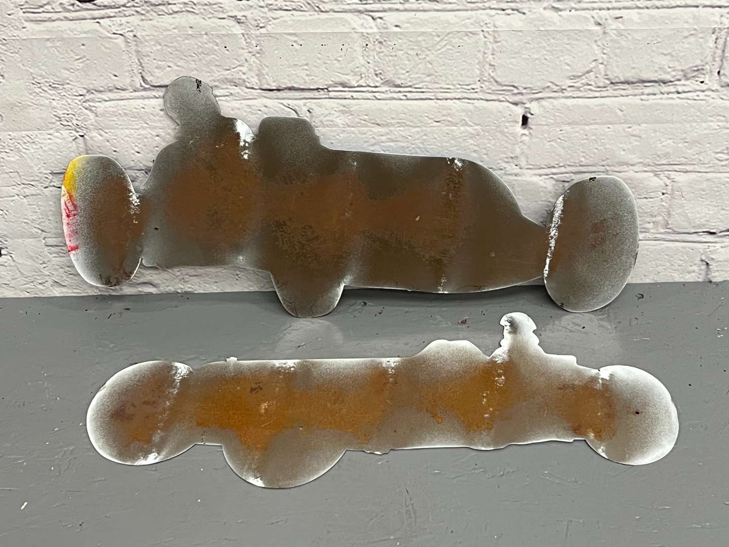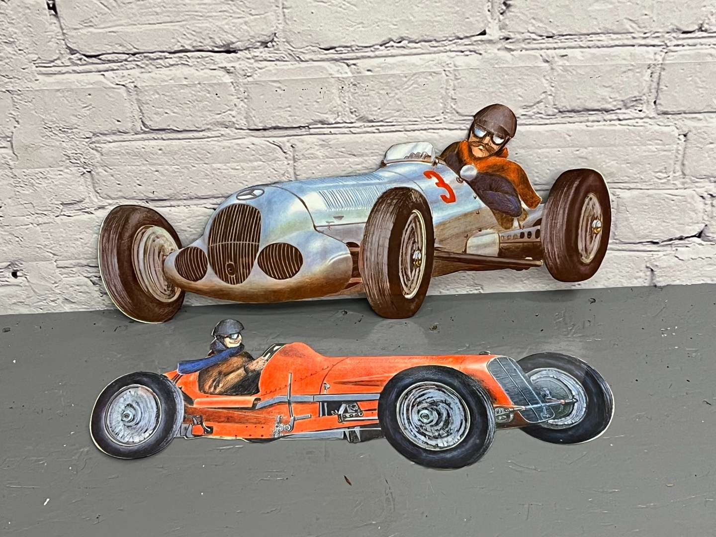 Two Modern Metal Vintage Race Car Signs